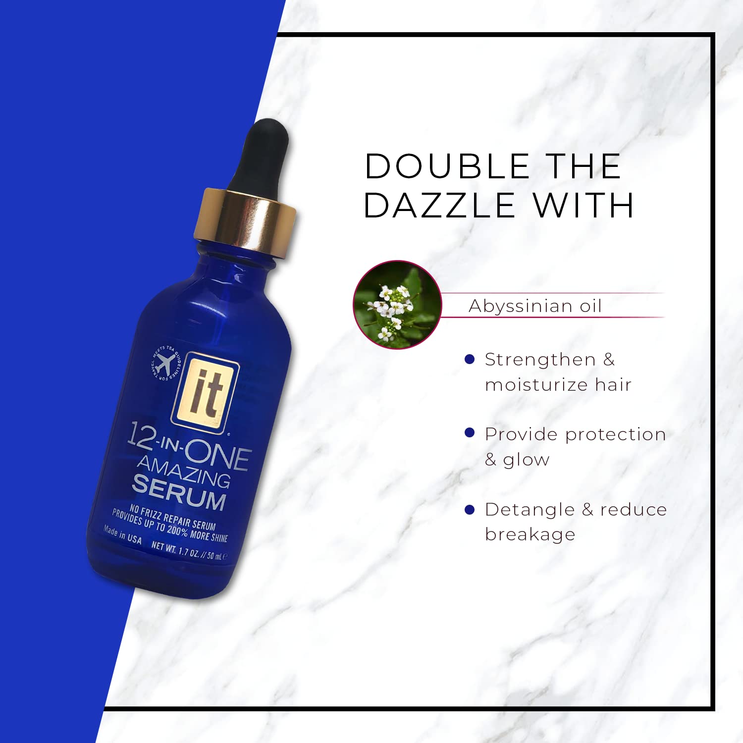 It Hair Care 12-in-One Serum is infused with Abyssinian Oil which forms a light continuous layer to help detangle and lock in essential moisture taming hair breakage and reducing split ends.