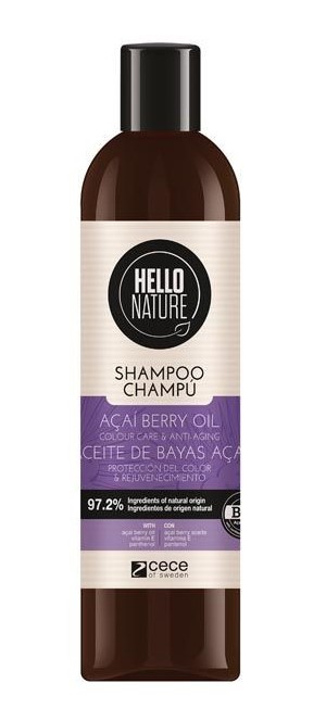 Hello Nature Acai Berry Oil shampoo Color care and anti-aging formula gently cleanse the hair and scalp. It provides intense color care, restores elasticity, and gives the hair a youthful appearance.