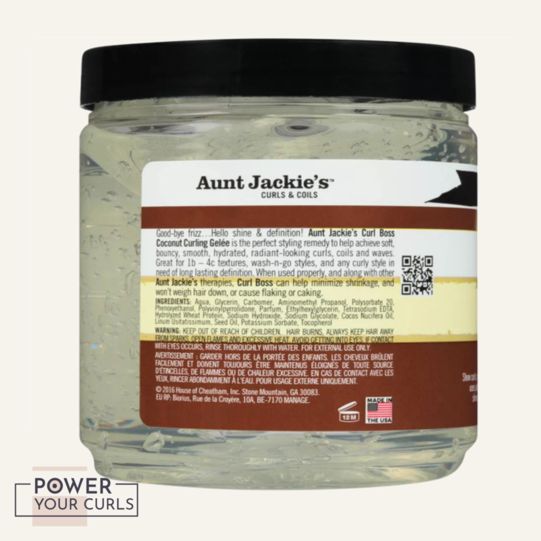 Aunt Jackie’s Curl Boss Coconut Curling Gelée is the perfect styling remedy for help achieve soft, bouncy, smooth, hydrated, radiant-looking curls, coils and waves. Great for 1c – 4c textures, wash-n-go styles, and any curly style in need of long lasting moisture. When used properly, and along with other Aunt Jackie’s therapies, Curl Boss can help minimize shrinkage, and won’t weigh hair down, or cause flaking or caking.