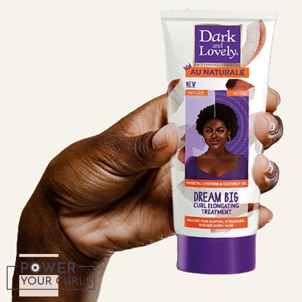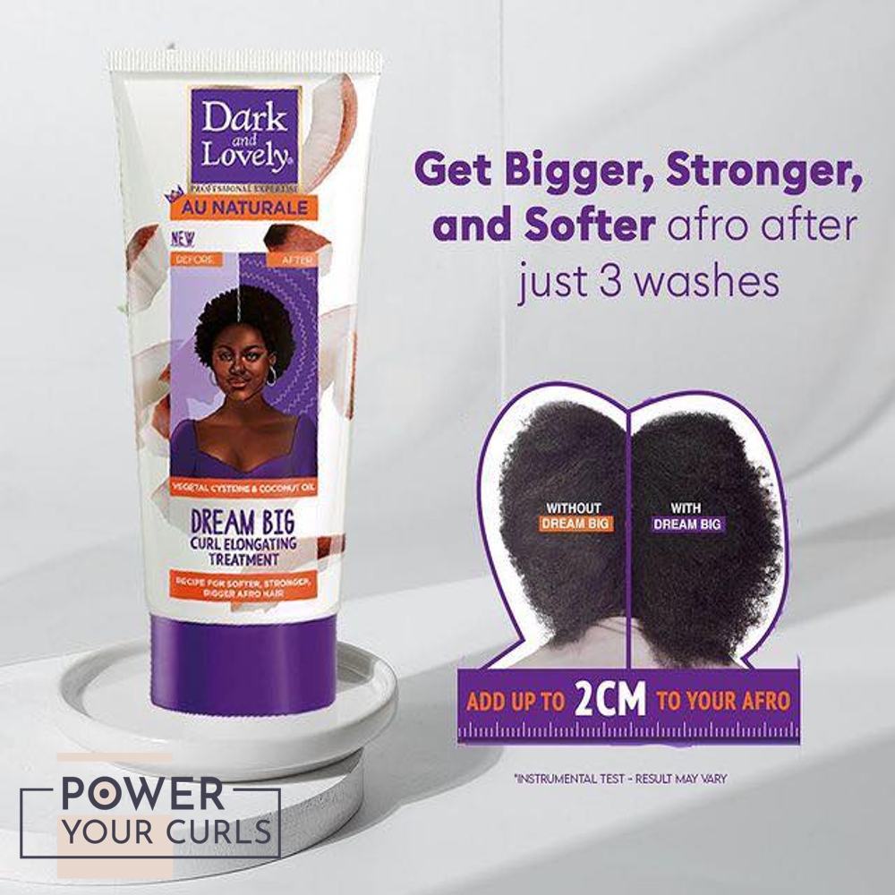 Discover Dream Big Curl Elongating Treatment. Dark and Lovely’s 1st Curl Elongating Treatment with 5% Vegetal Cysteine and Coconut Oil. Developed with Dark and Lovely’s Patented System and Co-developed with African Hairstylists. Tested on 500 African Women (Curls Type 4A to 4C).