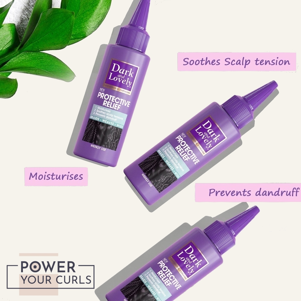 Castor and Marula Oils infused in the Dark and Lovely Protective Relief will instantly soothe and nourish your scalp.