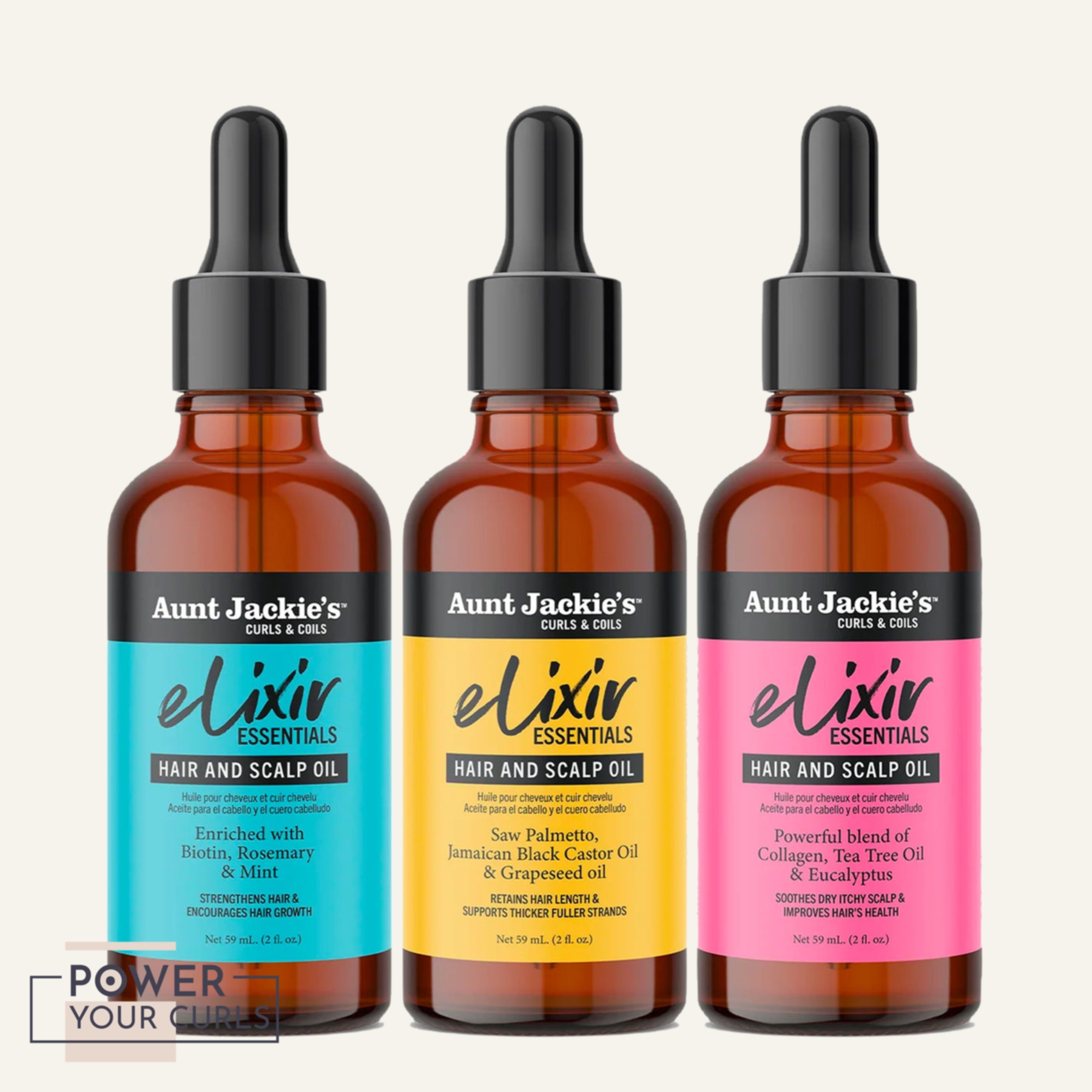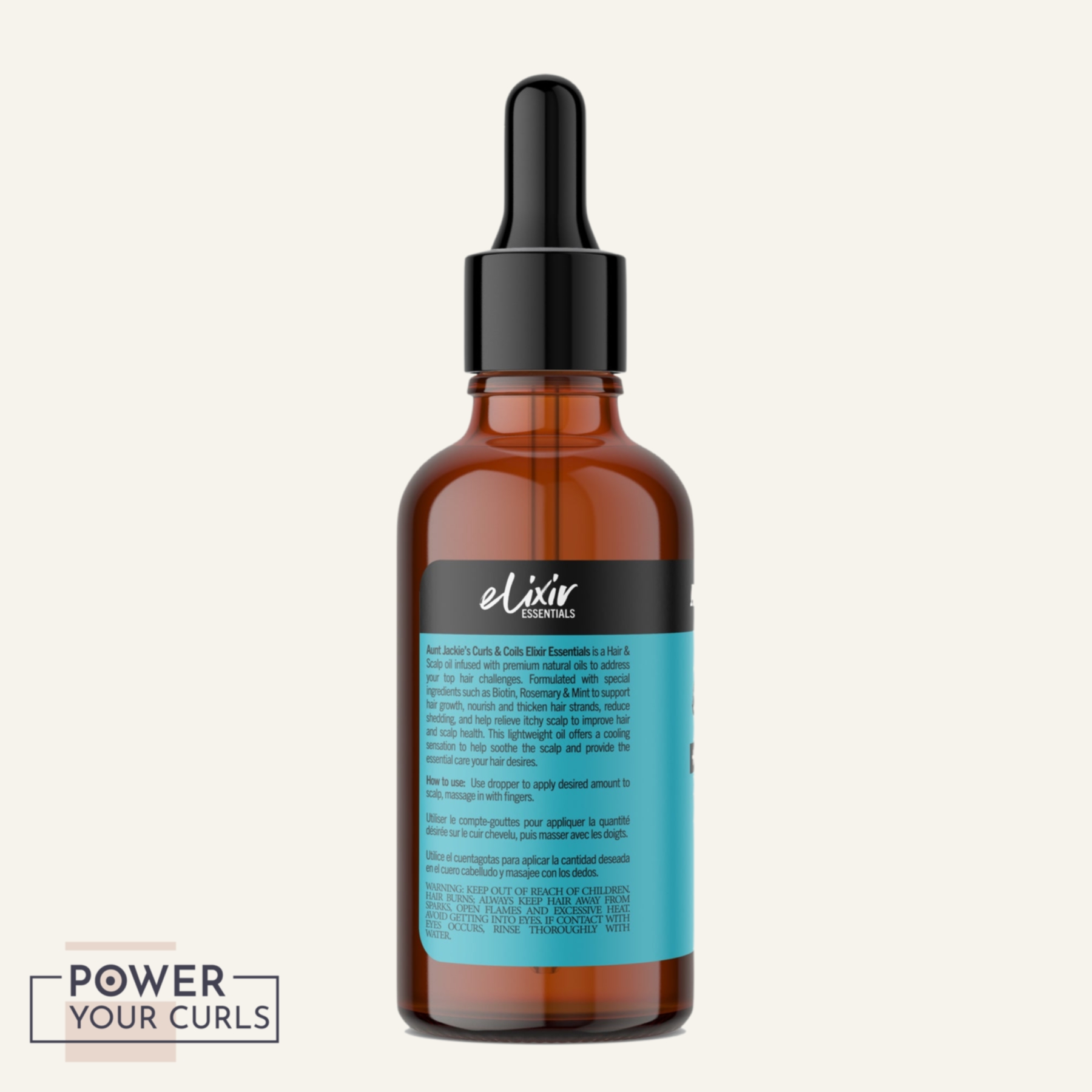 Aunt Jackie’s Curls & Coils Elixir Essentials is a Hair & Scalp Oil infused with premium natural oils to address your top hair challenges. Formulated with special ingredients such as Biotin, Rosemary & Mint to support hair growth, nourish and thicken hair strands, retain hair length, and reduce breakage. This lightweight oil provides the essential care elements you desire to achieve healthy hair.
