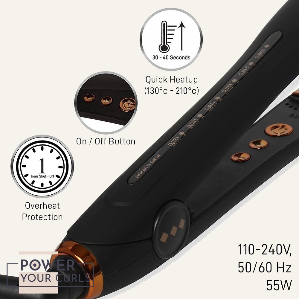 The gleam straightener has longer plates for styling longer, thicker hair. Its Rose-gold plates emit gentle, far-infrared heat that eliminates frizz and gently straightens the hair without damaging it.