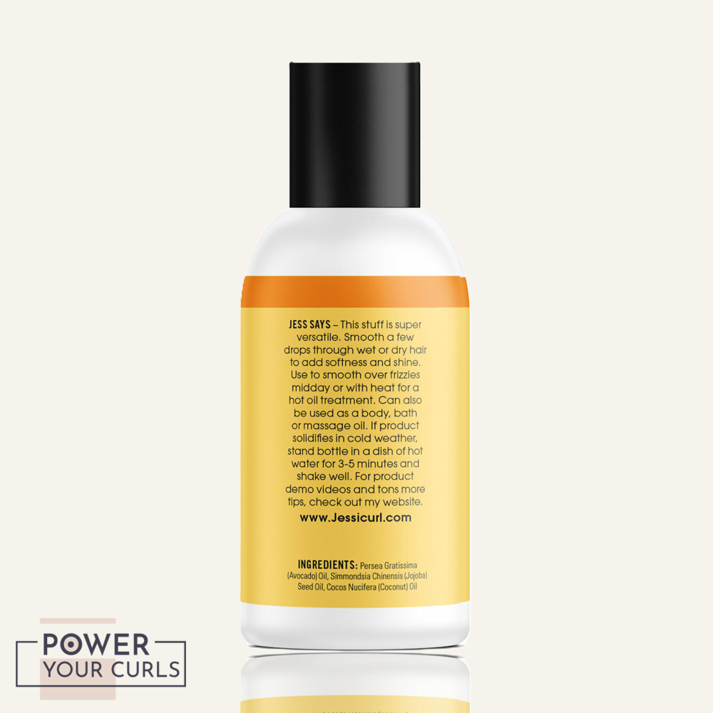 This stuff is super versatile. Smooth a few drops through wet or dry hair to add softness and shine. Use to smooth over frizzies midday or with heat for a hot oil treatment. Apply a few drops with your styling products for extra moisture or use with Jessicurl Deep Conditioning Treatment to make an even more intense combo. It can also be used as a body, bath or massage oil. If oil solidifies in cold weather, stand bottle in a dish of hot water for 3-5 minutes and shake well.