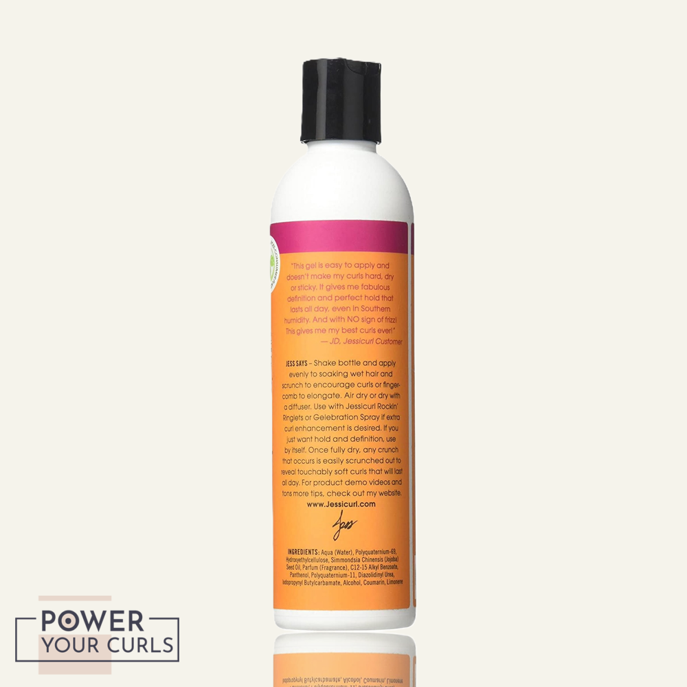 Apply evenly to soaking wet hair and scrunch to encourage curls or finger-comb to elongate. Air-dry or dry with a diffuser. Use with Jessicurl Gelebration Spray or Rockin’ Ringlets if extra curl enhancement is desired. If you just want hold and definition, use by itself. Once fully dry, any crunch that occurs is easily scrunched out to reveal touchably soft curls that will last all day.