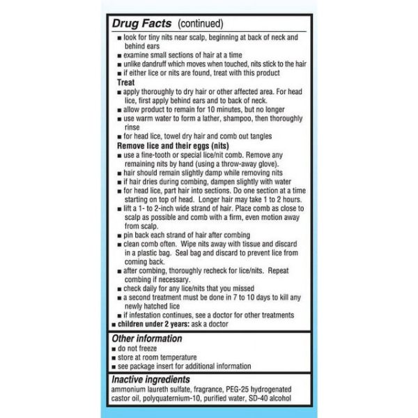 Apply thoroughly to dry hair or other affected areas. For head lice, first, apply behind the ears and to the back of the neck. Allow product to remain for 10 minutes, but not longer. Use warm water to form a lather, shampoo, then thoroughly rinse. For head lice, towel dry hair and comb out tangle