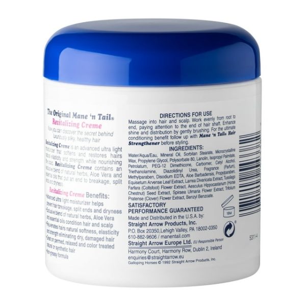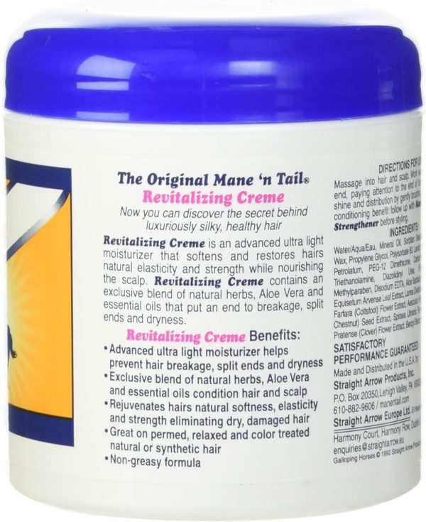 Mane ‘n Tail revitalizing creme is an advanced ultra-light moisturizer that softens and restores hair’s natural elasticity and strength while nourishing the scalp. Revitalizing creme contains an exclusive blend of natural herbs, mixed with Aloe Vera and essential oils that put an end to breakage, spilt ends, and dryness.
