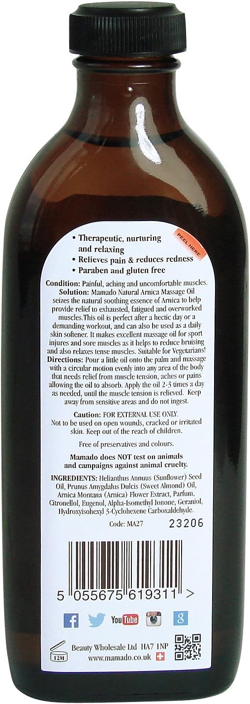 Mamado Natural Arnica Massage Oil seizes the natural soothing essence of Arnica to help provide relief to exhausted, fatigued, and overworked muscles. This oil is perfect after a hectic day or a demanding workout, and can also be used as a daily skin softener. It makes an excellent massage oil for sports injuries and sore muscles as it helps to reduce bruising and also relaxes tense muscles. Suitable for vegetarians!