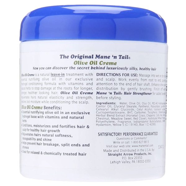 Mane ‘n Tail Olive Oil Creme is a natural leave-in treatment with essential nutrifying olive oil in our exclusive hydro-gel conditioning formula with vitamins and natural herbs to stop damage at the roots for longer, stronger healthier-looking hair. Olive Ole Creme rejuvenates hair’s natural elasticity and strength, and restores lost moisture while conditioning the scalp.