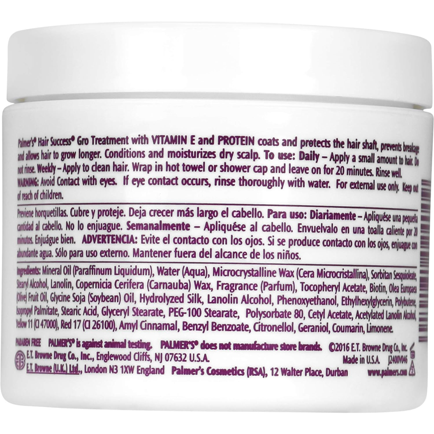 Palmer’s Hair Success Gro Treatment, a revolutionary water-resistant emulsion formula that combines Vitamin E, Olive Oil, and Soy Protein, coats and protects the hair shaft, allowing hair to grow longer. Hair is protected from humidity and other harsh environmental factors. Also conditions and moisturizes dry scalp.