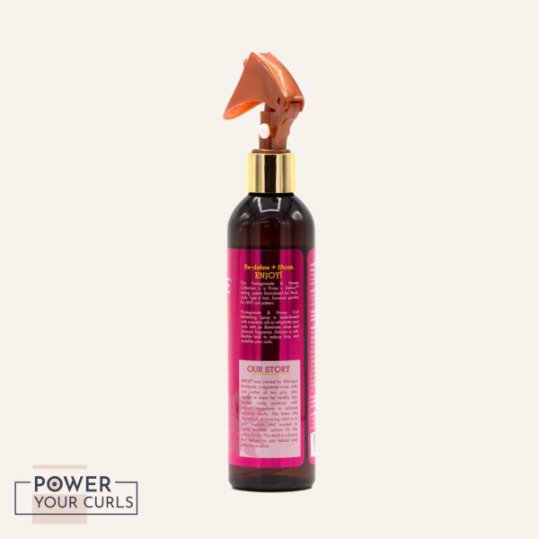 Pomegranate & Honey Curl Refreshing Spray is water-based with essentials oils to rehydrate your curls with an illuminating shine and pleasant fragrance while delivering a soft, flexible hold to reduce frizz and re-define your curls.
