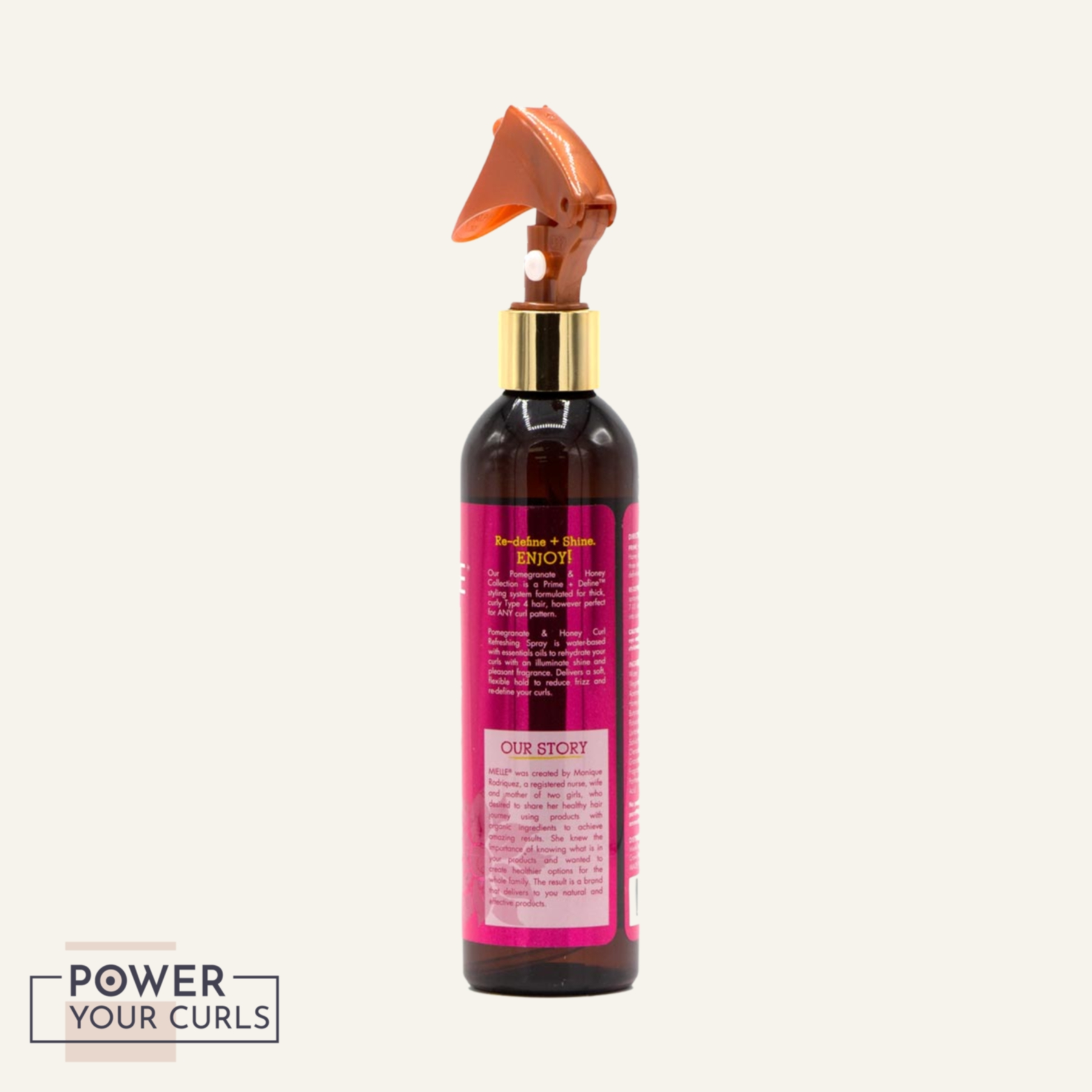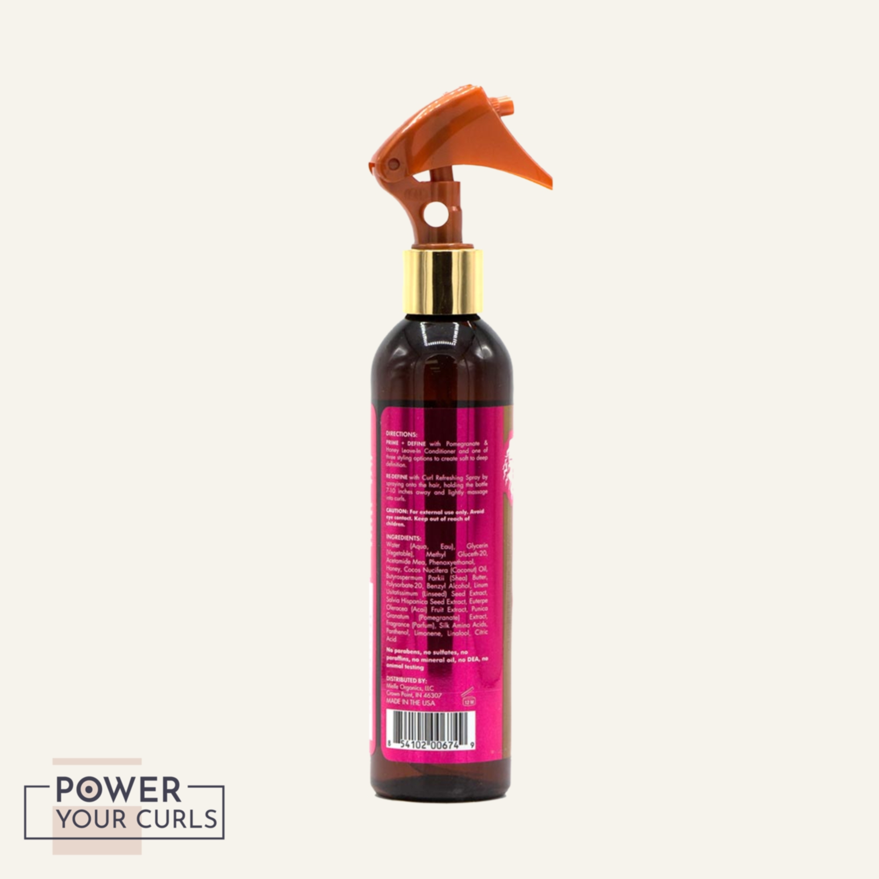 Pomegranate & Honey Curl Refreshing Spray is water-based with essentials oils to rehydrate your curls with an illuminating shine and pleasant fragrance while delivering a soft, flexible hold to reduce frizz and re-define your curls.