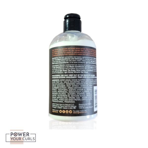 How to use: Wet hair completely and apply a generous amount of tgin Quench 3-in-1 Cleansing Co-Wash Conditioner to cleanse scalp and remove excess product build up. Rinse well with warm water. Follow with tgin Green Tea Super Moist Leave in Conditioner, or for extra conditioning, tgin Honey Miracle Hair Mask.