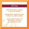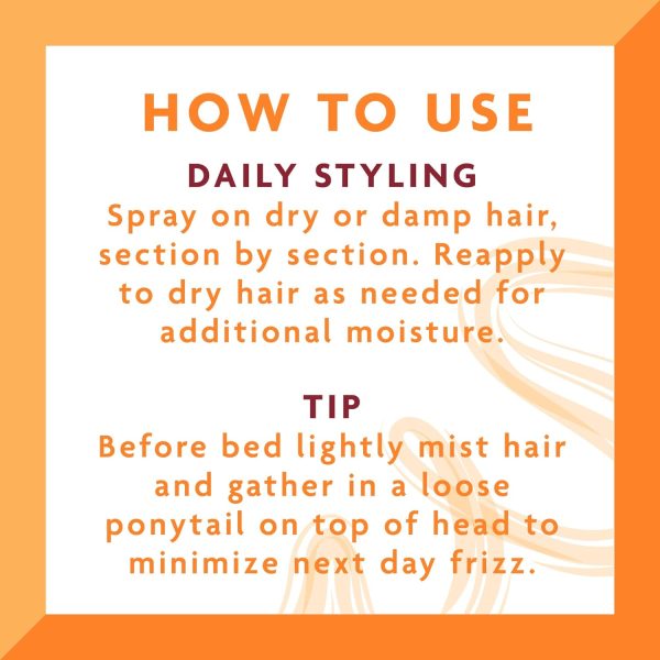 Spray on dry or damp hair, section by section, to restore, refresh, and revive curls, coils, and waves. Reapply to dry hair as needed for additional moisture. Before bed lightly mist and gather in a loose ponytail on top of the head to minimize next-day frizz.